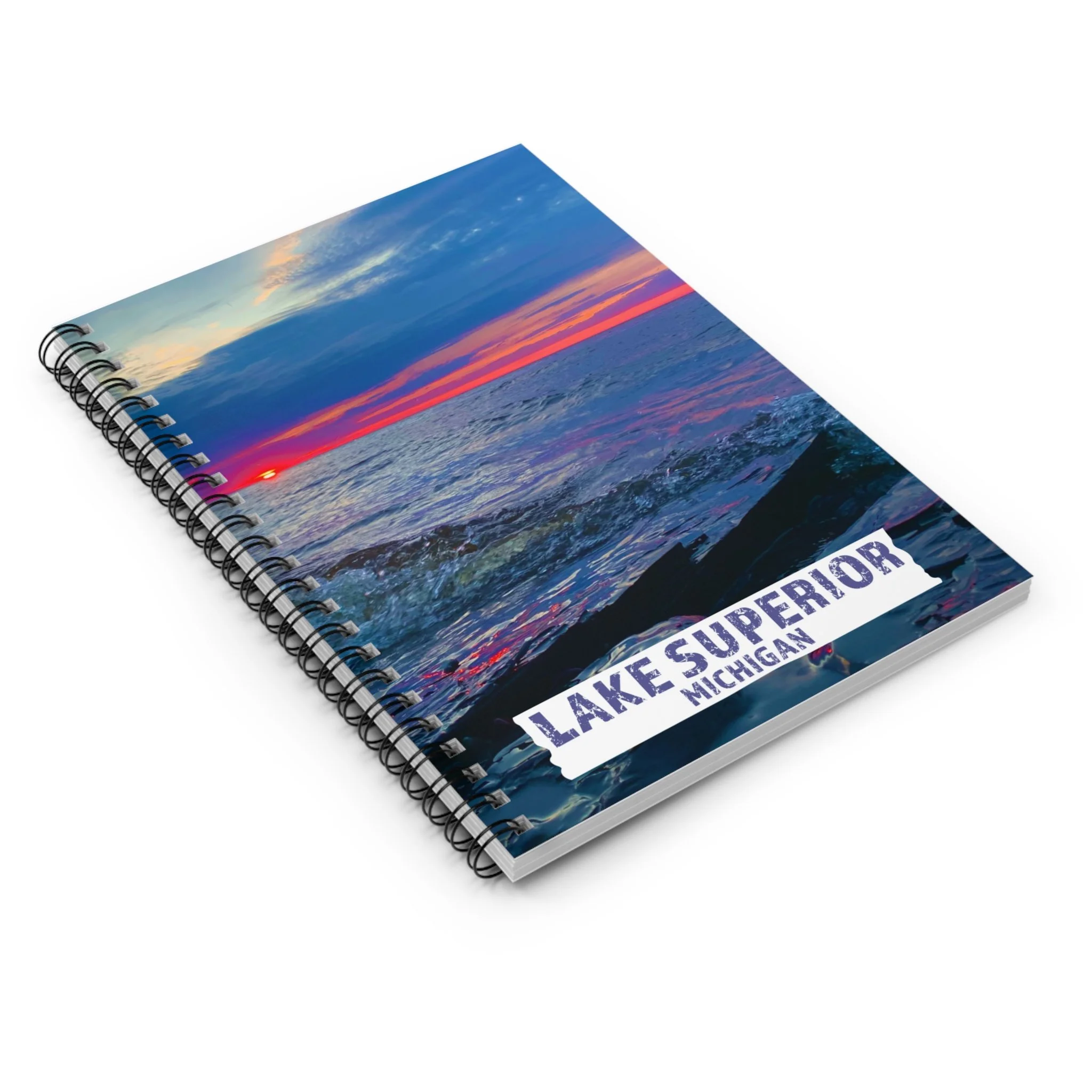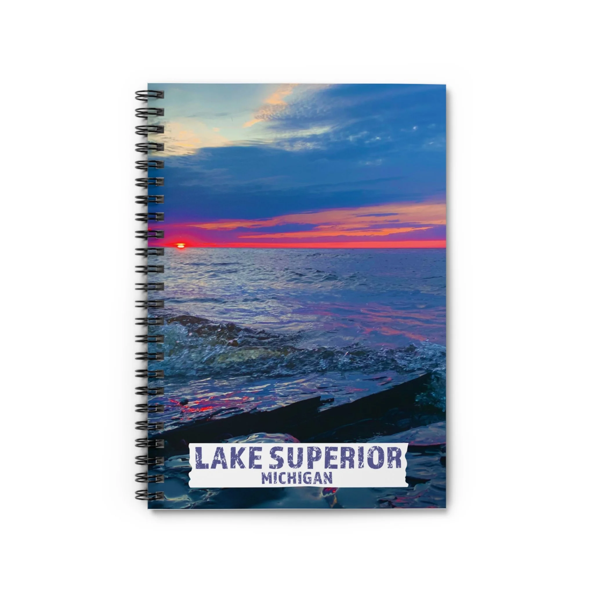 Inspired by wide-open water and unforgettable sunsets, this Lake Superior Michigan notebook features a real photo of a sunset taken along the legendary shores of Lake Superior.